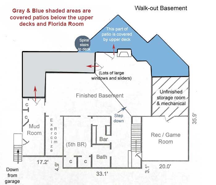 The large walk-out basement of Greystone features the 5th and 6th bedrooms (could be used for game room or other purpose), with seperate bath that is shared with the basement, plus a large open room, small exercise room, bar, and lower walk-out mudroom with back stair access up to the garage. The central area is quite large, and this area accommodated our theater and pool table with lots to spare. Unfortunately, the rock fireplace is decorative only because when the house was build, the 40' tall chimney was sealed shut by careless masons! We really never used it...it is possible that it could be opened. The decorative logs stay with the house.